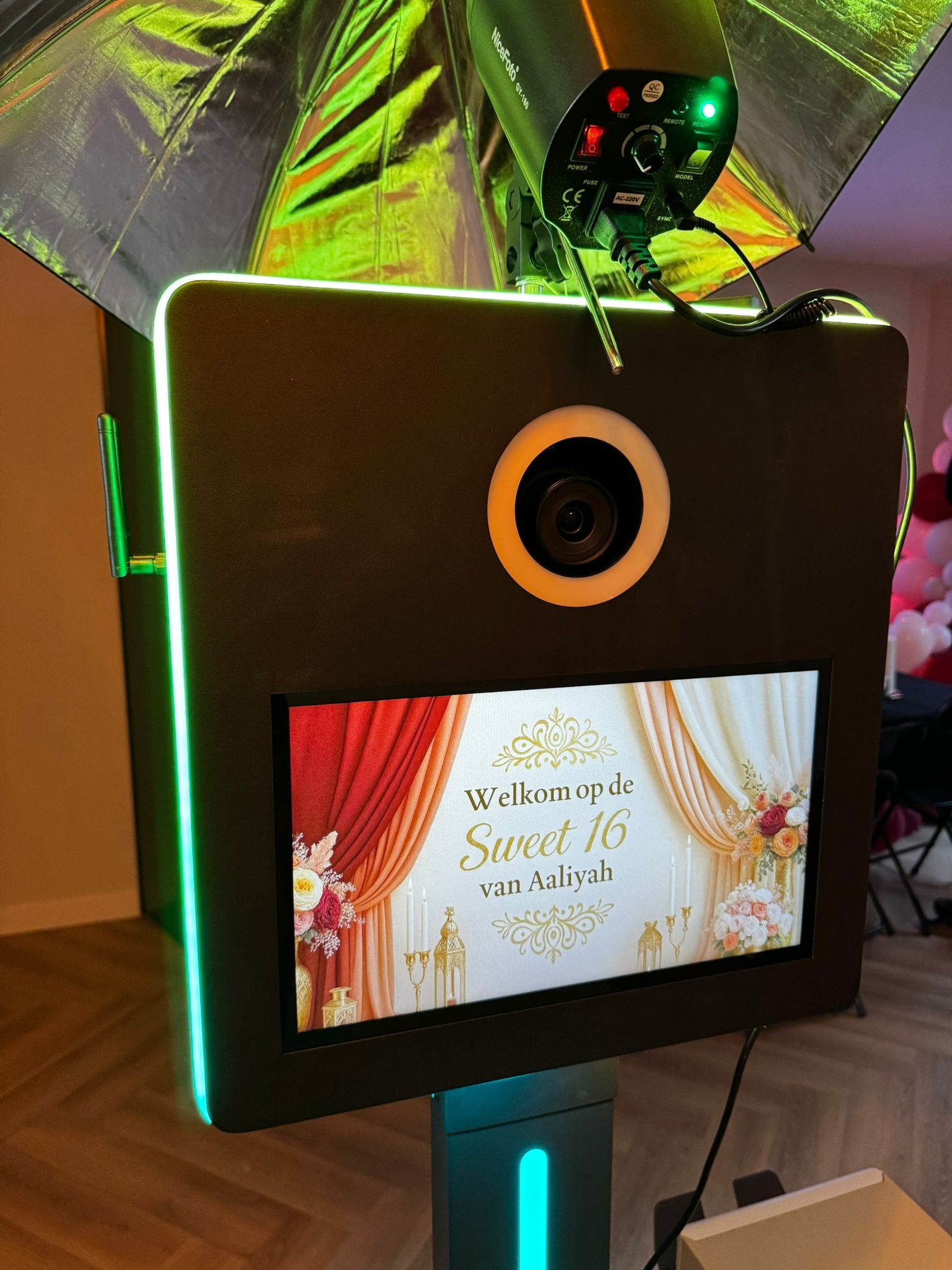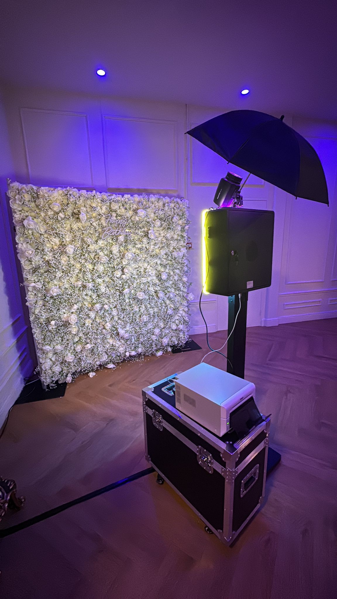 We hebben een stabiele stroomaansluiting nodig. Voor de 360° videobooth is extra ruimte handig; de photobooth past vaak in een compacte hoek.